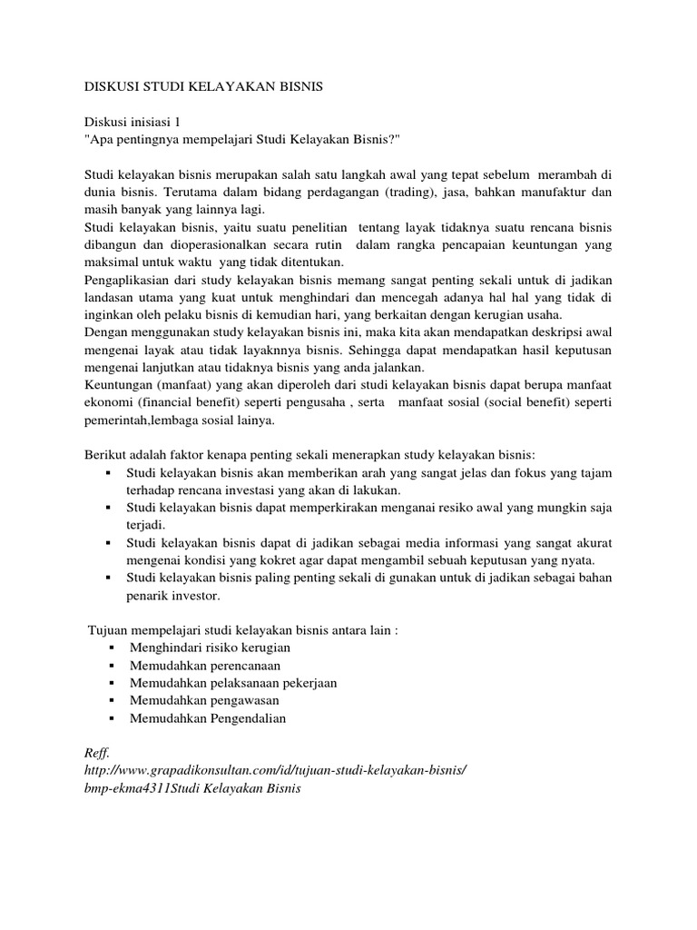 Pentingnya studi kelayakan bisnis bagi perusahaan Ceramah tugas membaca dan diskusi Media. Contoh soal diskusi Studi Kelayakan Bisnis 02. Hasil studi kelayakan bisnis Hasil studi kelayakan bisnis berupa dokumentasi lengkap dalam bentuk tertulis yang diperlihatkan bagaimana rencana bisnis memiliki nilai-nilai positif bagi aspek-aspek yang diteliti sehingga akan dinyatakan sebagai proyek bisnis yang layak.