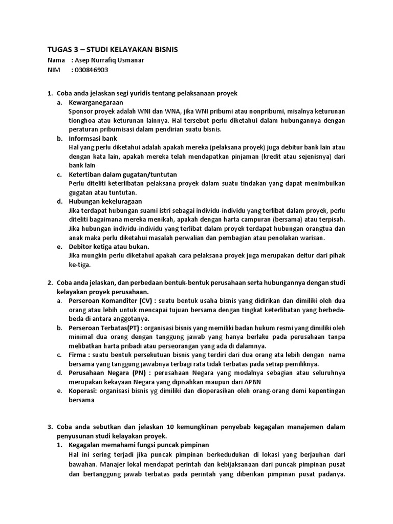 Immi Fiska Nama dan Bentuk Perusahaan Bentuk Perusahaan. Menjelaskan fungsi studi kelayakan perusahaan untuk perusahaan atau lembaga-lembaga bukan pencari laba. Studi Kelayakan Bisnis No Tugas Tutorial 1 Berikan penjelasan singkat tentang masalah eksternalitas hakikat AMDAL dan landasan hukum AMDAL Jawab.