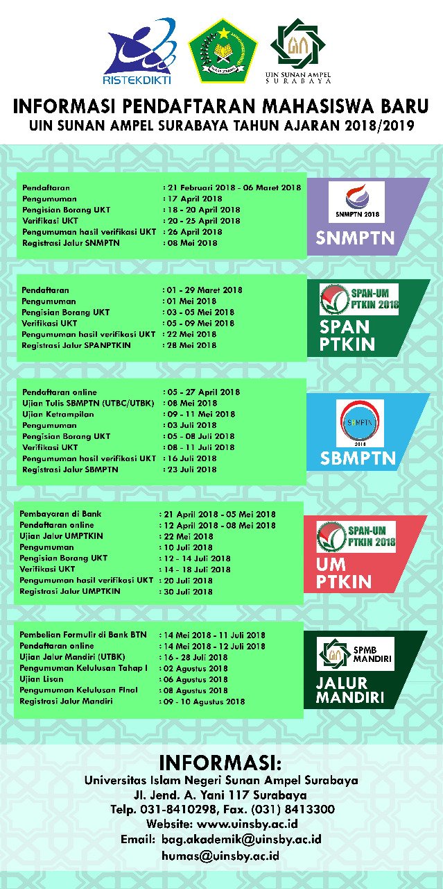 Uinsa Surabaya على تويتر Informasi Pendaftaran Mahasiswa Baru Uin Sunan Ampel Surabaya 2018 2019 Dari Beberapa Jalur Yaitu Snmptn Span Ptkin Sbmptn Um Ptkin Jalur Mandiri Yuk Tentukan Pilihanmu Dan Jangan Lupa Segera Daftar