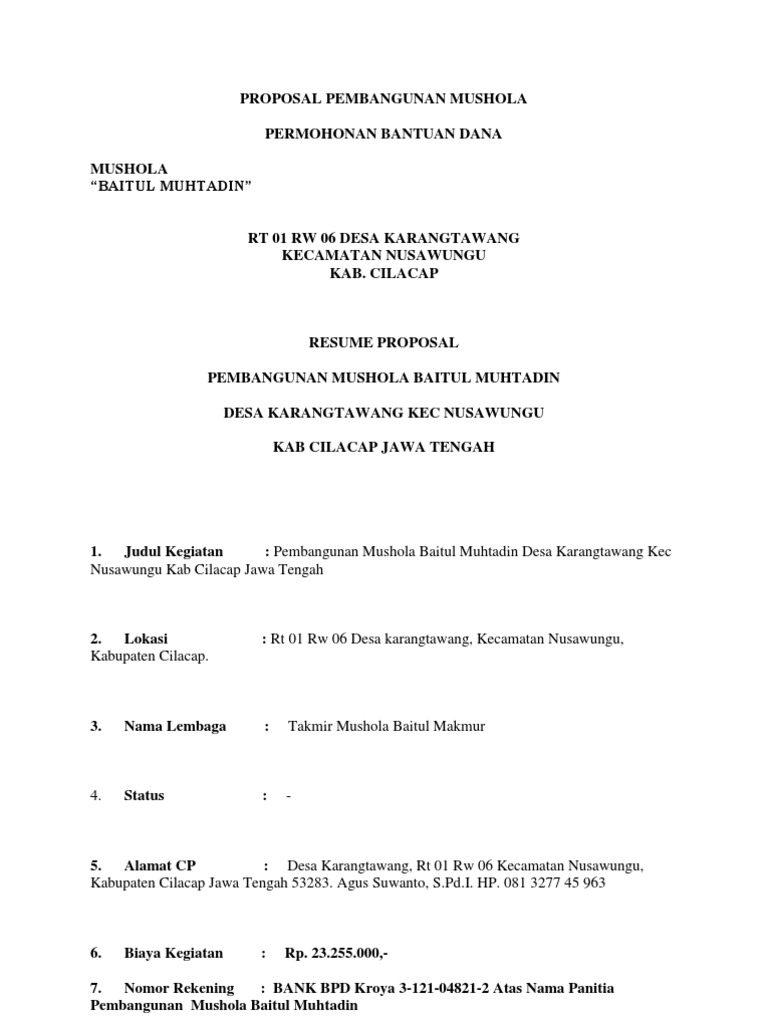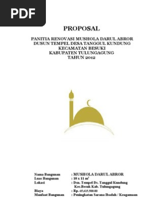 Contoh proposal pembangunan musholla al mustakim berikut ini merupakan proposal yang dapat anda jadikan referensi untuk membuat permohonan bantuan dana untuk pembangunan mushola. Contoh proposal pembangunan musholla al mustakim berikut ini merupakan proposal yang dapat anda jadikan referensi untuk membuat permohonan bantuan dana untuk pembangunan mushola. Nama Bangunan Luas Bangunan Lokasi Biaya Manfaat Bangunan.