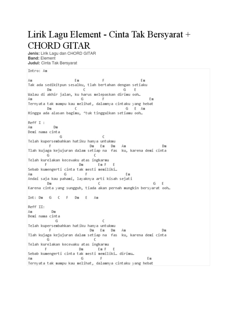 Element kemudian mengemas ulang album ini pada 2006 menjadi Neo Resonansi dengan tambahan enam. Berikut chord kunci gitar dan lirik Cinta Tak Bersyarat dari Element versi termudah. Am Em Tak ada sedikitpun sesalku F C Tlah bertahan dengan setiaku Dm Walau diakhir jalan C G E Kuharus melepaskan dirimu Am Em Ternyata tak mampu kau.