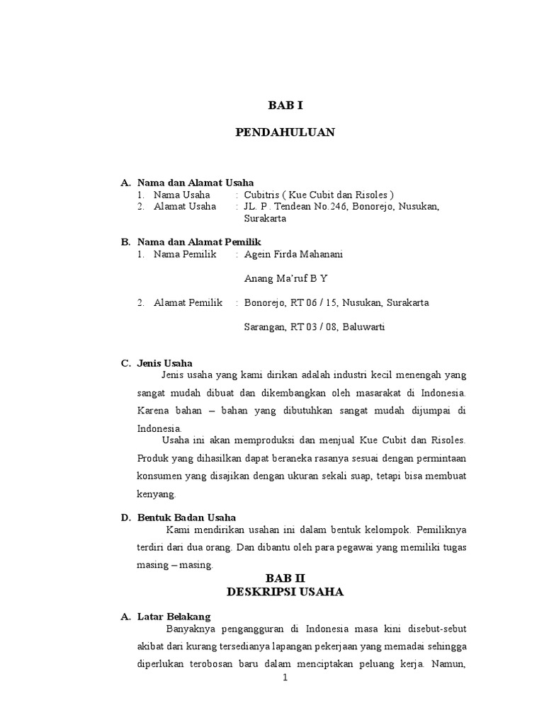 Contoh Proposal usaha makanan pembuatan kuegorengan KATA PENGANTAR Puji dan syukur kami panjatkan kepada Alloh SWT karena atas rahmat dan keridoannyakami bisa membuat suatu gagasan usaha yang Insya Alloh akan bermanfaat bagi kami sebagai. Pada umumnya kue cubit menggunakan campuran susu dan tepung terigu sebagai komponen utamanya. Usaha kue cubit green tea ini didirikan dengan membuka kedai sederhana dengan konsep jaman dulu sehingga memberi nuansa kempada pada.